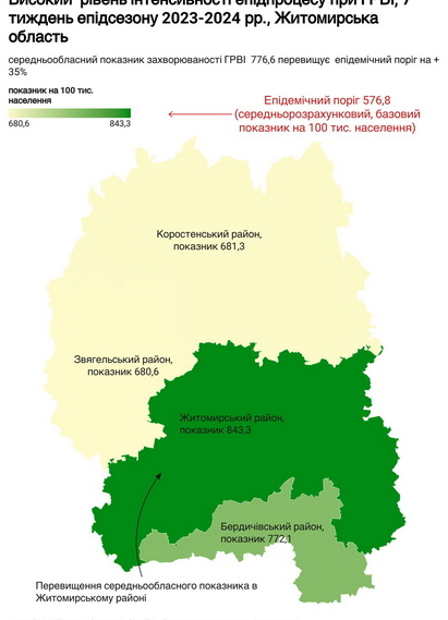 «Епідемічний поріг перевищено в усіх 4-х районах області. Найвищі рівні захворюваності відмічаються в Житомирському районі. За звітний тиждень захворюваність знизилась в основному за рахунок дитячого населення, що в першу чергу пов’язано з запровадженням обмежувальних заходів організованих колективах. Питома вага госпіталізованих серед захворілих щотижня залишається майже незмінною та коливається в межах 2-3%. 70% госпіталізованих – діти до 17 років. Захворюваність на COVID-19 має тенденцію до зниження», - йдеться у повідомленні.