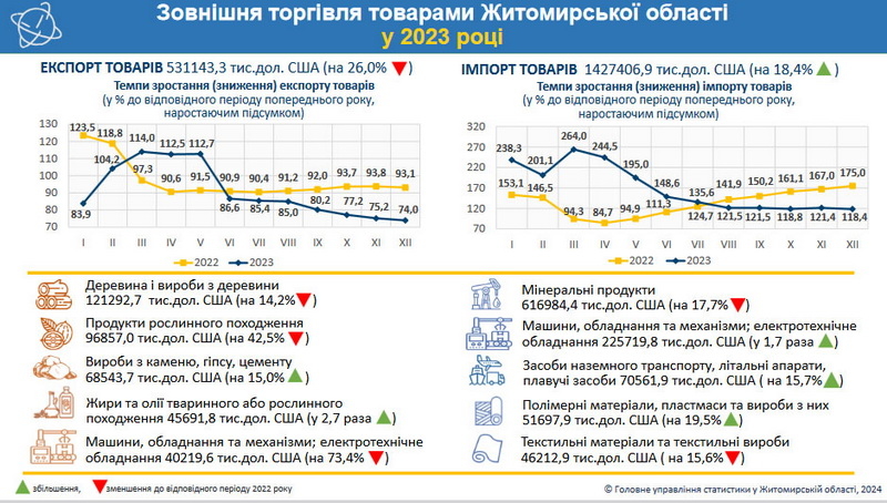 Нагадаємо, у січні-листопаді 2023 року в Житомирській області експорт товарів становив 491 млн 923,1 тис. дол., імпорт – 1 млрд 251 млн 509,4 тис. дол., від’ємне сальдо склало 759 млн 586,3 тис. дол.