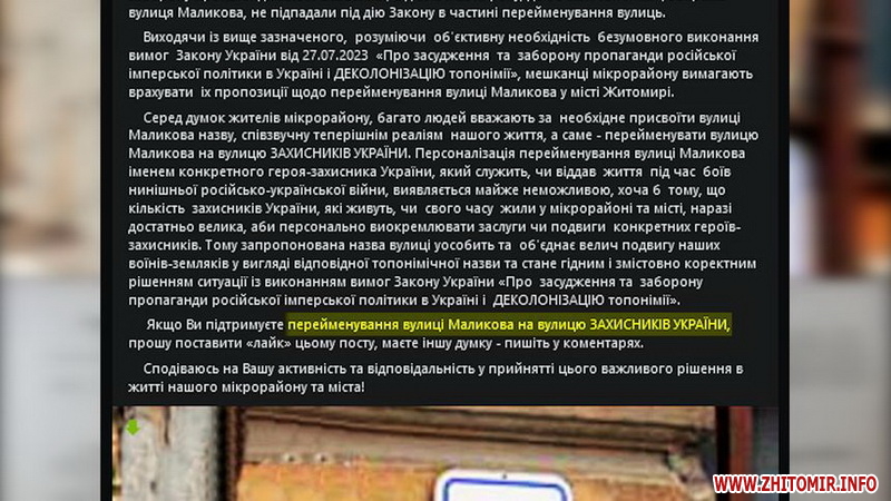 У Житомирі знову порушують питання про перейменування вулиці Маликова.
