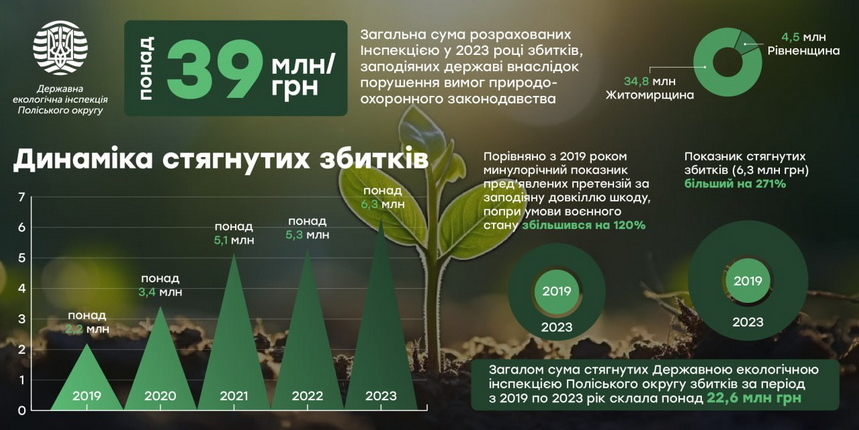 «Загалом сума стягнутих Державною екологічною інспекцією Поліського округу збитків за період з 2019 по 2023 рік склала понад 22,6 млн грн», - інформують екологи.