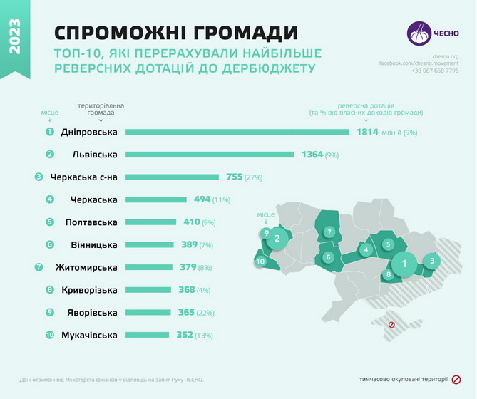 2023 року на десять громад припало понад 45% усього обсягу реверсних дотацій. Серед них шість громад – обласних центрів: Дніпровська, Львівська, Черкаська, Вінницька, Полтавська, Житомирська міські громади, а також Криворізька, Яворівська, Мукачівська міські громади та Черкаська селищна громада.