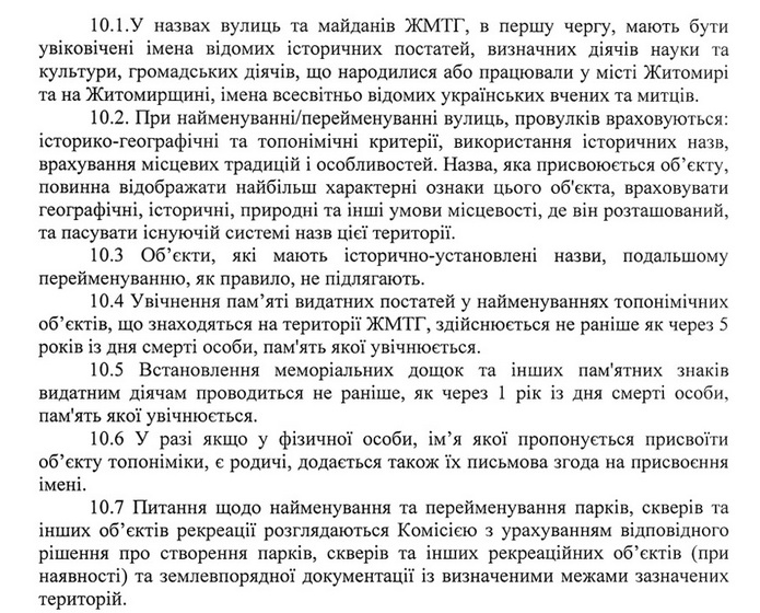 «Просимо внести зміни до рішення виконавчого комітету, а саме: в пункт 10.4 в положення про міську комісію з топоніміки та викласти його в наступній редакції: увічнення пам’яті видатних постатей у найменуваннях топонімічних об’єктів, що знаходяться на території Житомирської міської територіальної громади, здійснюються не раніше, ніж через 5 років з дня смерті особи, пам’ять якої увічнюється. Ми додаємо: «Окрім осіб, яким присвоєне звання «Герой України», - повідомила головна архітекторка Житомира Ольга Бронштейн.