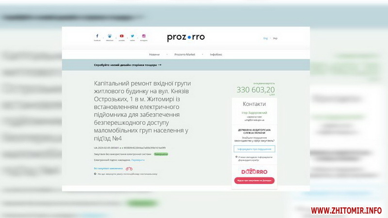 Управління житлового господарства Житомирської міської ради оголосило тендер на капітальний ремонт вхідної групи житлового будинку на вул. Князів Острозьких, 1 з встановленням електричного підйомника. Очікувана вартість – 330 тисяч 603 грн.