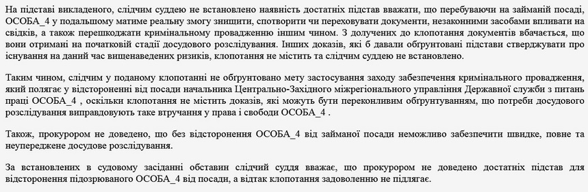 «У ході досудового розслідування є необхідність у відсторонення від посади підозрюваного ОСОБА_4, оскільки є достатньо підстав вважати, що перебування останнього на посаді сприяло вчиненню кримінального правопорушення, а також те, що перебуваючи на посаді підозрюваний знищить, підробить речі та документи які мають суттєве значення для досудового розслідування, незаконно впливатиме на свідків та інших учасників кримінального провадження, протиправно перешкоджатиме провадженню іншим чином, а саме: ОСОБА_4 перебуваючи на посаді начальника Центрально-Західного міжрегіонального управління Державної служби з питань праці користуючись налагодженими зв`язками та здобутими знайомствами, може особисто або опосередковано негативно впливати на хід досудового слідства та судового розгляду, через прохання, погрози або іншим шляхом щодо знищення, приховання або спотворення документів, що мають істотне значення для встановлення обставин кримінального правопорушення; перебуваючи на посаді начальника Центрально-Західного міжрегіонального управління Державної служби з питань праці ОСОБА_4 може впливати на працівників, свідків та заявника у даному кримінальному провадженні, з метою тиску на них. Таким чином, повідомлення ОСОБА_4 про підозру у вчиненні корупційного злочину передбаченого ч. 3 ст. 368, за який передбачено покарання у вигляді позбавлення волі, а також наведені ризики є підставами для відсторонення його від займаної посади», - зазначалося у клопотання слідчого.