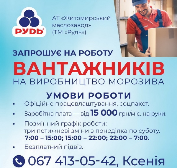 АТ «Житомирський маслозавод» (ТМ «Рудь») запрошує на роботу вантажників на виробництво морозива.