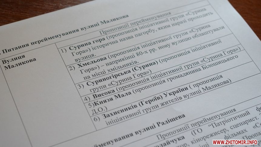 У Житомирі перейменують вулицю Маликова. Комісія з топоніміки розглянула шість варіантів назви, серед яких обрали дві, які винесуть на громадське обговорення.