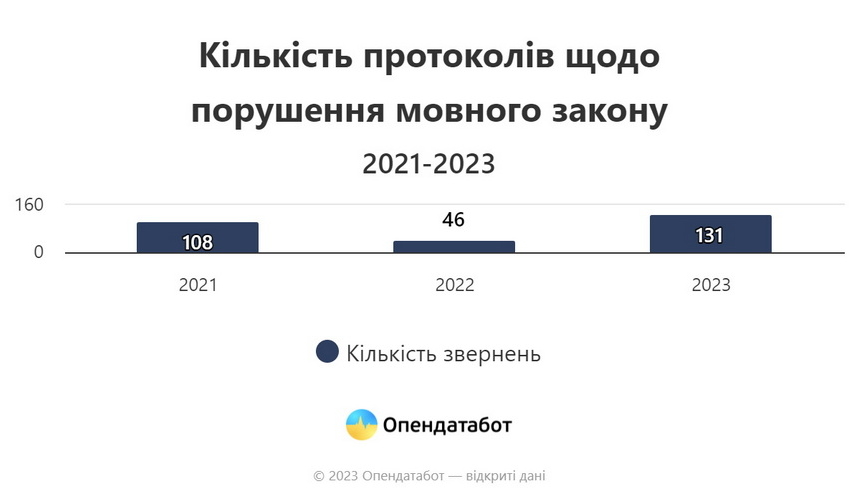 131 протокол про порушення мовного закону було складено за 2023 рік. Це у 1,2 раза більше, ніж у 2021 — 108 протоколів. Для порівняння, у 2022 таких протоколів було лише 46.