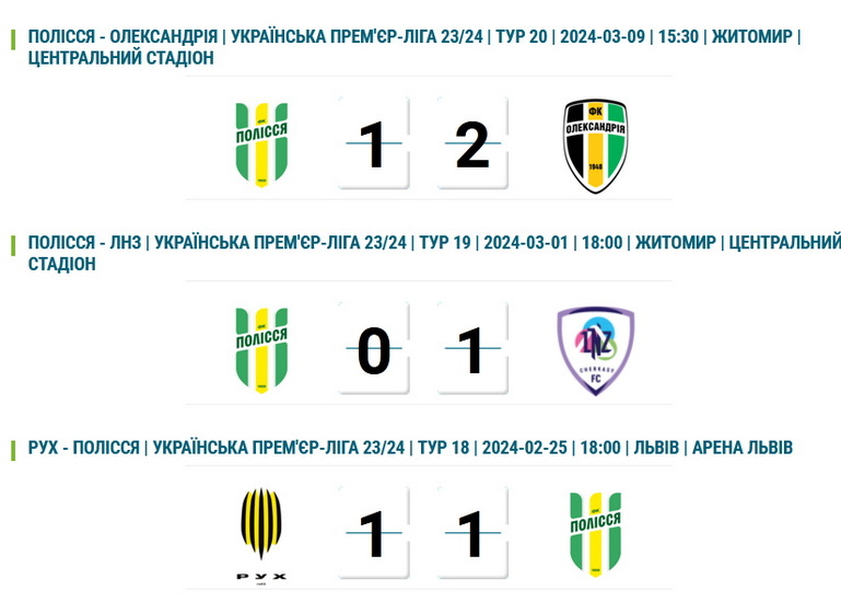 Нагадаємо, 25 лютого цього року житомирське «Полісся» зіграло внічию із львівським «Рухом»: рахунок гри 1:1. У грі 1 березня футбольний клуб «Полісся» 1 березня на останніх хвилинах матчу програв черкаському «ЛНЗ», а 9 березня у домашньому поєдинку поступився ФК «Олександрія» з рахунком 1:2.