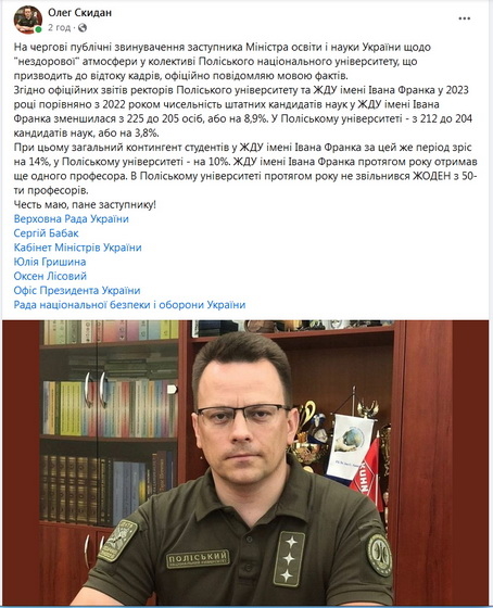 «На чергові публічні звинувачення заступника Міністра освіти і науки України щодо «нездорової» атмосфери у колективі Поліського національного університету, що призводить до відтоку кадрів, офіційно повідомляю мовою фактів. Згідно офіційних звітів ректорів Поліського університету та ЖДУ імені Івана Франка у 2023 році порівняно з 2022 роком чисельність штатних кандидатів наук у ЖДУ імені Івана Франка зменшилася з 225 до 205 осіб, або на 8,9%. У Поліському університеті – з 212 до 204 кандидатів наук, або на 3,8%. При цьому загальний контингент студентів у ЖДУ імені Івана Франка за цей же період зріс на 14%, у Поліському університеті – на 10%», - йдеться у дописі, оприлюдненому вранці 12 березня.