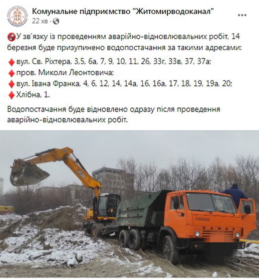 Понад 20 будинків та провулок у Житомирі 14 березня залишились без води. Аварійно-відновлювальні роботи тривають.