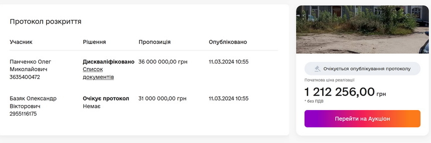 Після дискваліфікації Панченка переможною визнали наступну пропозицію: 31 млн грн від ФОП Базяк Олександр Вікторович, який зареєстрований у Житомирі в 2018 році і має основний вид діяльності «роздрібна торгівля залізними виробами, будівельними матеріалами та санітарно-технічними виробами в спеціалізованих магазинах».