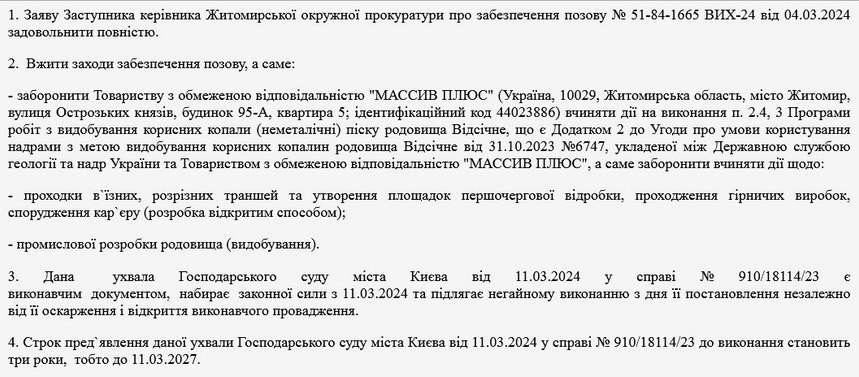 «Прокурор вважає, що вчинення відповідачем-2 (ТОВ «Массив Плюс») дій з проходки в’їзних, розрізних траншей та утворення площадок першочергової відробки, проходження гірничих виробок, спорудження кар’єру, промислова розробка родовища (видобування) порушить екосистему водосховища та створить передумови для зміни технологій очищення води, вкладення додаткових коштів з боку держави, в даному випадку Житомирською міською радою, для переоснащення обладнання, зміни технології забору води. У зв`язку з наведеним, у разі задоволення позову прокурора, вчинення відповідачем-2 вищевказаних дій утруднюватиме приведення у попередній стан спірних правовідносин. Зважаючи на викладене, з метою недопущення порушень прав держави в сфері надрокористування та епідеміологічного благополуччя населення, прокурор просить суд вжити заходи забезпечення позову шляхом заборони відповідачу-2 - Товариству з обмеженою відповідальністю «Массив плюс» вчиняти дії на виконання п. 2.5, 3 Програми робіт з видобування корисних копалин, що є Додатком 2 до Угоди про умови користування надрами з метою видобування корисних копалин родовища Відсічне від 31.10.2023 №6747», - йдеться в ухвалі суду.