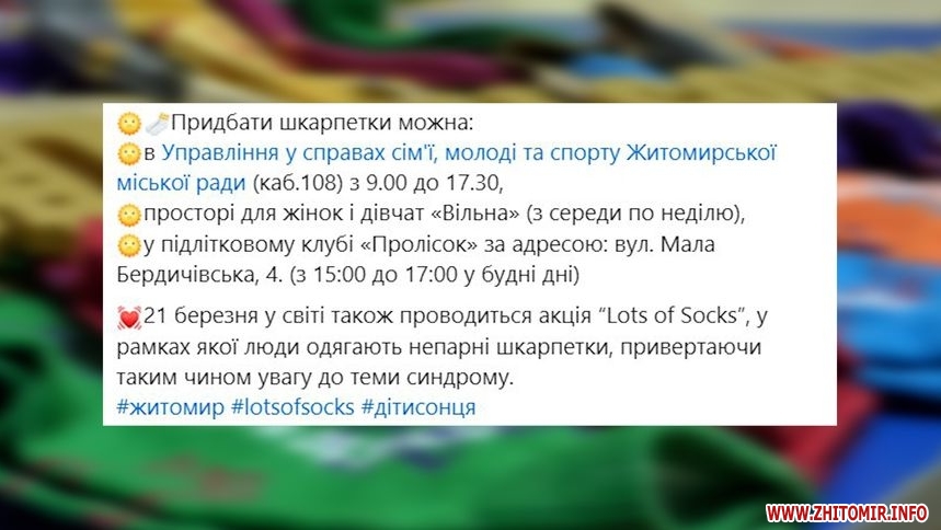 «Цьогоріч, як завжди, ми проводимо нашу таку благодійну акцію «Кольорові шкарпетки», #Шкарпетуся, «Lost of socks», і просимо залучатись до придбання цих акційних шкарпеток»,- говорить заступниця керівника ГО «ЖОГО «Діти Сонця» Людмила Рибчинська.