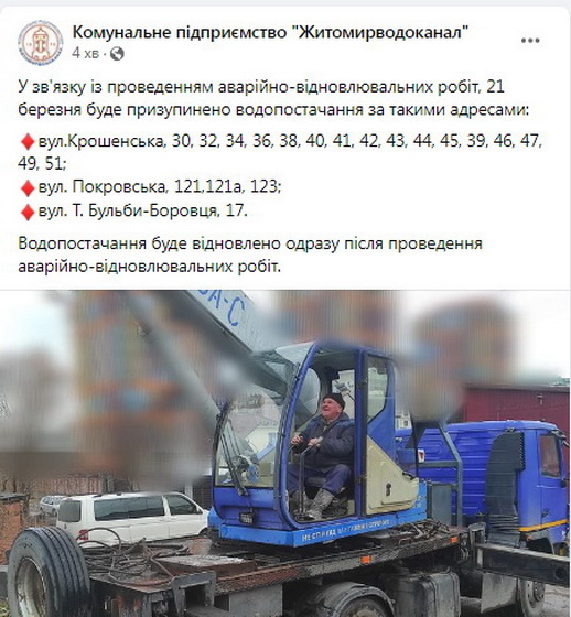 Як повідомляв Житомир.info, у Житомирі 13 березня 2024 року було відсутнє водопостачання у двох кварталах та багатоповерхівці через аварійно-відновлювальні роботи.