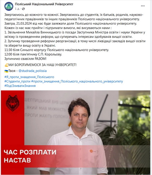 «Завтра, 21.03.2024 від нас буде залежати доля Поліського національного університету. Кожен із нас має прийти і підтримати вимоги, які висуваються нами: 1. Звільнення Михайла Винницького із посади Заступника Міністра освіти і науки України у зв'язку із проведенням реформ, що суперечать інтересам здобувачів вищої освіти. 2. Зупинку проведення реформи реорганізації, в тому числі ліквідації закладів вищої освіти та зберегти вищу освіту в Україні», - зазначалося в анонсі, оприлюдненому вранці 20 березня на Facebook-сторінці Поліського національного університету.