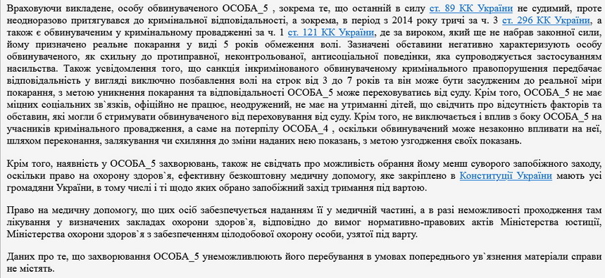 «Доводи сторони захисту не є такими, що беззаперечно можуть бути підставою для зміни запобіжного заходу, тому суд не може покласти їх в основу свого рішення і відмовляє у задоволенні клопотання сторони захисту про зміну обвинуваченому ОСОБА_5 запобіжного заходу тримання під вартою на домашній арешт із застосуванням електронних засобів контролю. Продовжити ОСОБА_5 дію запобіжного заходу у виді тримання під вартою на строк до 13.05.2024 (включно)», - зазначається в ухвалі суду.