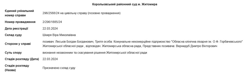 Корольовський районний суд м.Житомира 22 березня 2024 року отримав позов Богдана Леськіва до Житомирської обласної ради щодо визнання незаконним та скасування рішення облради.