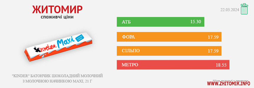 Моніторинг здійснено на основі інформації, отриманої за методом контрольної закупки 21.11.2025 р. у місцях продажу: АТБ, пр. Миру, 15а, Фора, вул. Київська, 106, Метро, вул. Ватутіна, 55в, Сільпо, вул. Житній ринок, 1