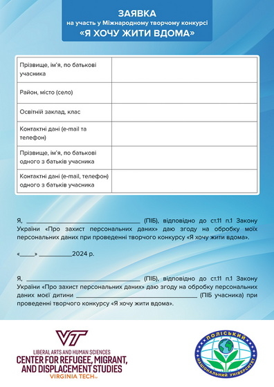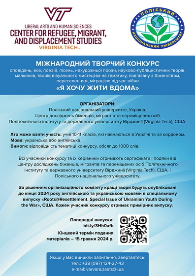 Поліський національний університет спільно з Центром досліджень біженців, мігрантів та переміщених осіб Політехнічного інституту та державного університету Вірджинії (Virginia Tech), США, проводять творчий конкурс оповідань, есе, поезій, пісень, нехудожньої прози, науково-публіцистичних творів, малюнків, творів візуального мистецтва на тематику, пов’язану з біженством, переселенням, міграцією під час війни «Я хочу жити вдома».