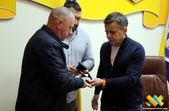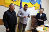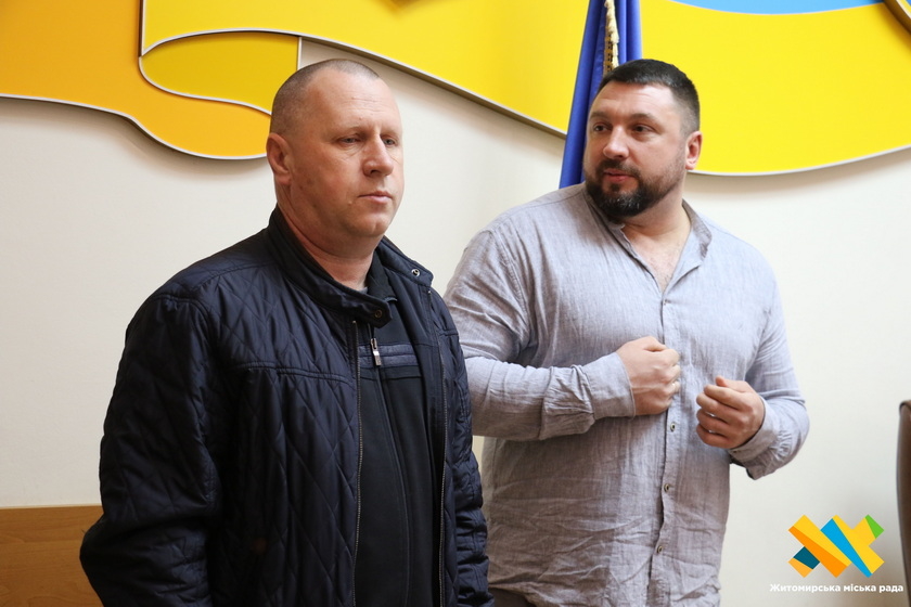 На фото військовослужбовець Андрій Краснобокий та начальник управління у справах ветеранів війни Житомирської міської ради Андрій Забігайло