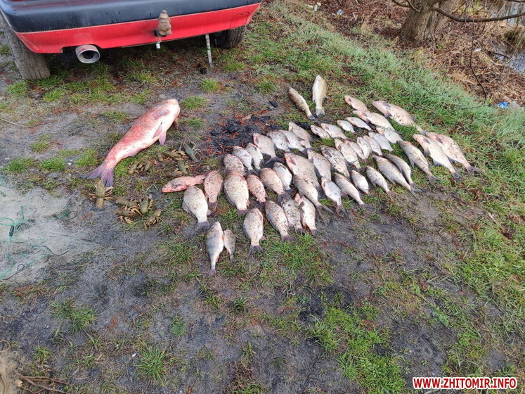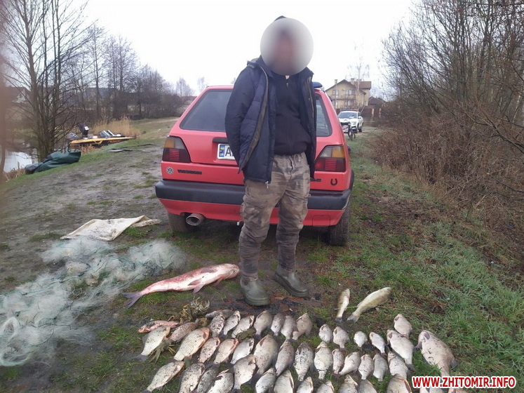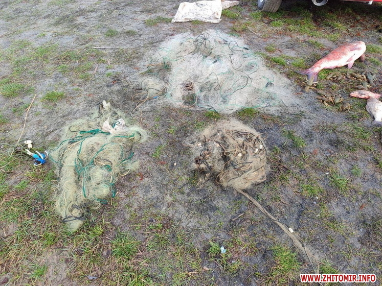«30 березня о 06:00 год на річці Тетерів поблизу с. Тетерівка Житомирського району громадянин з гумового човна ловив рибу забороненими знаряддями лову, а саме: 3 лісковими сітками загальною довжиною 150 метрів. При цьому порушнику вдалося упіймати рибу: карась сріблястий - 11 екземплярів; судак - 2 екземпляри; окунь – 2 екземпляри; товстолоб - 1 екземпляр; лящ - 33 екземпляри; рак -12 екземпляри. Загальна вага виловлених водних біоресурсів становить 20,3 кг. Своїми діями горе-рибалка порушив розділ IV п. 1 п.п. 1 Правил любительського рибальства, відповідальність за що передбачено ч. 4 ст. 85 КУпАП України», - йдеться в повідомленні.