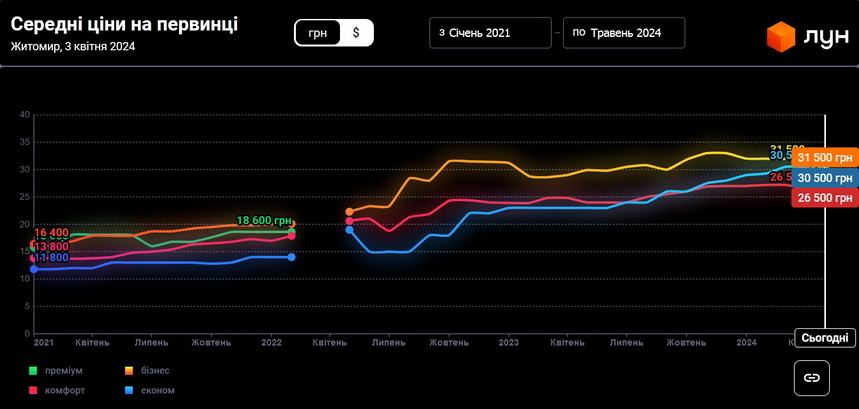 У обласному центрі вартість 1 кв.м «економ» почало випереджати «комфорт» з листопада 2023 року і зараз розрив вже є відчутним, а різниця між «комфорт» та «бізнес» лише 1 тисяча гривень.