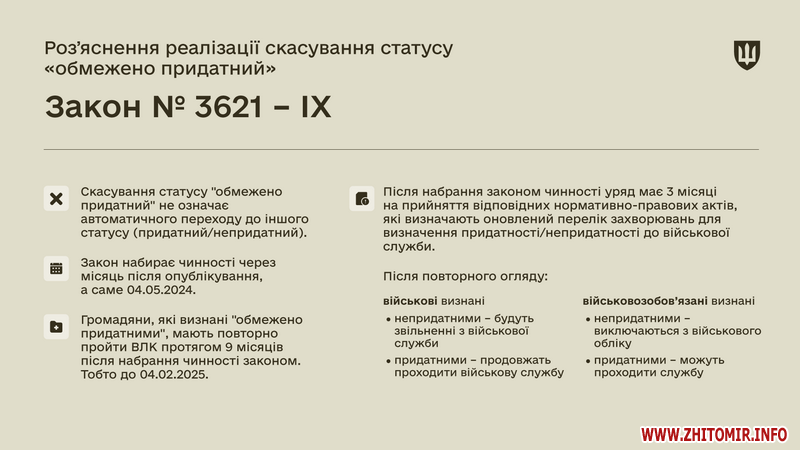 «4 квітня опубліковано підписаний Президентом Володимиром Зеленським закон № 3621-IX, який, зокрема, передбачає скасування статусу «обмежено придатний». Роз’яснюємо, що чекає на військових та військовозобов’язаних, які мають цей статус», - йдеться у повідомленні.