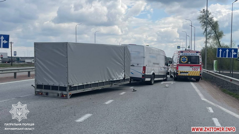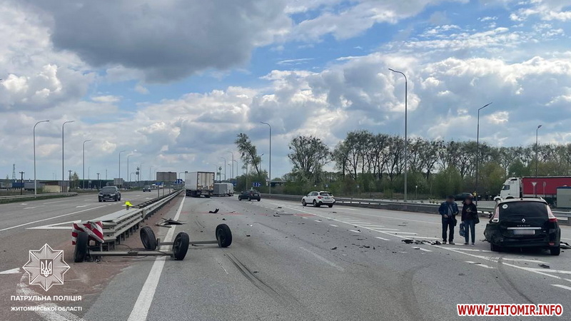«У зв'язку з дорожньо-транспортною пригодою без потерпілих, що сталася близько 12-ї години, на 127 км автодороги М-06 Київ — Чоп (поблизу села Гадзинка, Житомирської області), за участю 2 авто, одне з яких з причепом. Рух транспорту частково ускладнений в напрямку міста Києва та здійснюється крайньою лівою смугою», - йдеться у повідомленні.