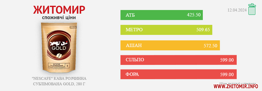 Моніторинг здійснено на основі інформації, отриманої за методом контрольної закупки 12.04.2024 р. у місцях продажу: АТБ, пр. Миру, 15 А, Фора, вул. Лятошинського, 2, Метро, вул. Ватутіна, 55-в, Сільпо, пл. Житній ринок, 1, Ашан, вул. Київська, 77