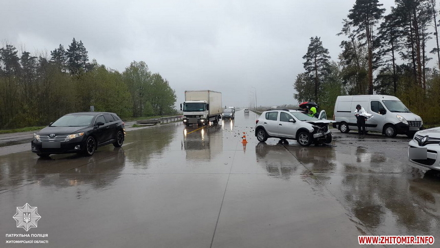 «У зв’язку з дорожньо-транспортною пригодою без потерпілих, що сталася близько 14-ї години на 130 км автодороги Київ – Чоп (об'їзна дорога Житомира), поблизу повороту на село Вереси Житомирської області, рух транспорту в обох напрямках ускладнений. Патрульні забезпечують регулювання та безпеку дорожнього руху», - йдеться у повідомленні.