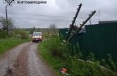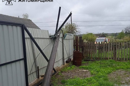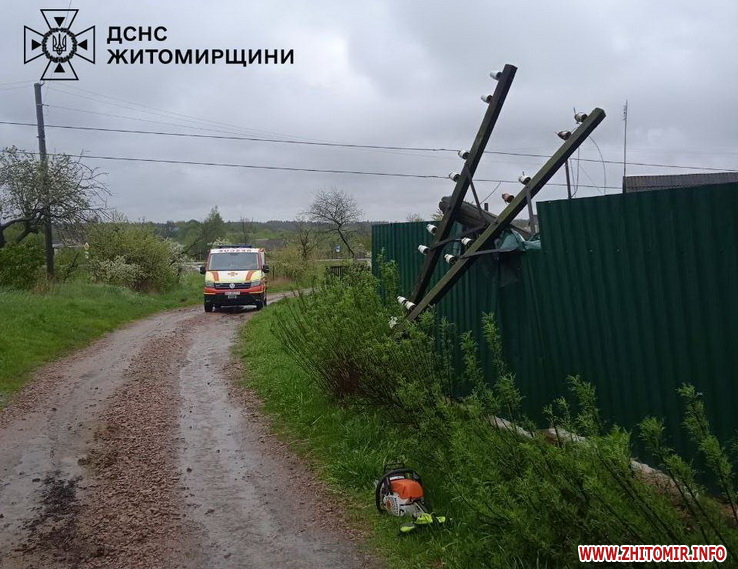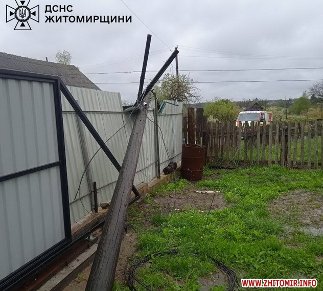 Крім того, вчора у с. Висока Піч Житомирського району внаслідок сильних поривів вітру старий аварійний стовп зв’язку впав на паркан подвір’я місцевої мешканки. Проводи повисли над проїжджою частиною. Бійці ДСНС за допомогою спеціального інструменту обрізали їх та відтягнули стовп з металевої конструкції паркану.