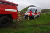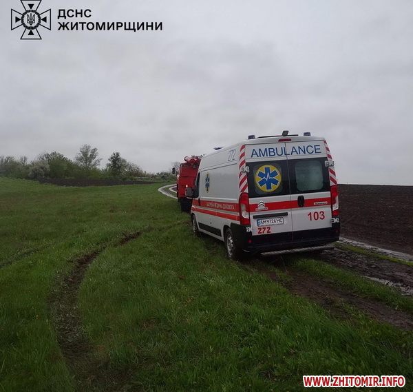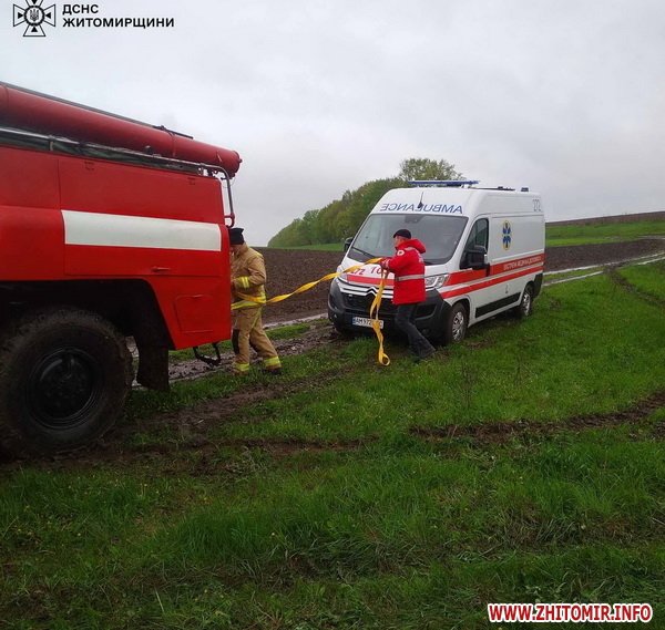 «21 квітня о 12:26 по лінії “101” надійшло повідомлення про те, що поблизу с. Подолянці Чуднівської територіальної громади Житомирської області застрягла швидка на бездоріжжі й необхідна допомога рятувальників. На місці події з’ясувалося, що автомобіль швидкої допомоги рухався на виклик у населений пункт та на ділянці польової дороги застряг у багнюці. Бійці ДСНС за допомогою буксирувального тросу та пожежної техніки відтягнули транспортний засіб на відстань у 1, 5 км, після чого медики змогли їхати далі на виклик», - йдеться у повідомленні.