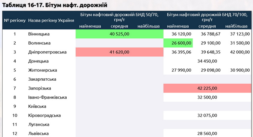 Зауважимо, що за даними моніторингу ДП «Національний інститут розвитку інфраструктури», у березні в Житомирській області найнижча ціна на дорожнього бітуму 70/100 становила 27,99 тис. грн, найвища – 30,9 тис. грн.