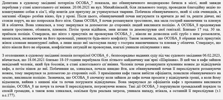 «Допитаний в судовому засіданні обвинувачений ОСОБА_3 свою вину не визнав, показав, що 18.06.2021 близько 18 год. просив милостиню на АДРЕСА_1, на одному з літніх майданчиків кав`ярні. Дівчина зробила йому зауваження з приводу зовнішнього вигляду, на що у відповідь міг щось словесно відповісти або образити. Однак ножа при собі не мав, нікому ножем не погрожував, і не розмахував. Умислу словесно когось ображати також не було. В руках тримав тростину та собаку, яку йому подарували на базарі. Був одягнутий в шорти, камуфляжну куртку. Ствердив, що потерпілу не наздоганяв, оскільки фізично не міг це зробити. В цей час з кафе вибігли офіціанти, напали на нього, повалили на землю, можливо декілька разів вдарили, забрали собаку. Прибули працівники поліції, проводили поверхневий огляд, що саме в нього вилучили вже не пам`ятає, однак точно пам`ятає, що предмету схожого на ніж при собі не мав. Після чого його доставили до відділу поліції, де відібрали пояснення та відпустили. 20.06.2021 був на вул. Михайлівській, можливо спілкувався з кимось, конфлікту не було. Вважає, що жінки його обмовляють, оскільки він їм зовнішньо не сподобався. Ствердив, що ні кого не ображав, не плювався і тростиною не розмахував», - йдеться у матеріалах суду.