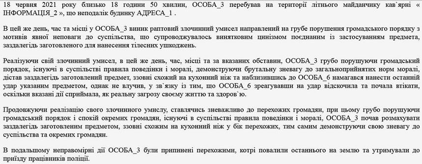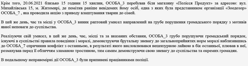 У справі описано кілька епізодів хуліганства, яке чоловік вчиняв у центрі Житомира, на Михайлівській: 18 червня 2021 року він намагався вдарити ножем жінку біля літнього майданчика одного з кафе, його скрутили перехожі та передали поліції; 20 червня цього ж року ображав та нападав на представницю організації «Зоодозор» і був затриманий поліцією.
