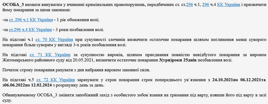 Суд визнав чоловіка винним за ч.1 та ч.4 ст. 296 КК України, присудив йому 3 роки позбавлення волі, до яких додав ще 25 днів за невідбуте раніше покарання за крадіжку. Також суд зарахував у строк покарання строк попереднього ув`язнення – з 24.10.2021 по 06.12.2021 та з 06.06.2022 по 12.02.2024 «з розрахунку день за день», тобто фактично хуліган вже відсидів половину строку – 1 рік 9 міс 20 днів з призначених судом 3 роки 25 днів.