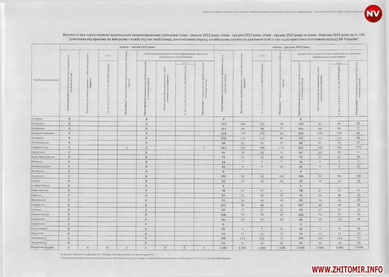 «Українські правоохоронні органи розпочали майже 11,3 тис. кримінальних проваджень через ухилення від призову чи порушення військового обліку з початку повномасштабного російського вторгнення у 2022 році. Про це йдеться у відповіді Офісу генерального прокурора на запит NV. Найбільше справ за ст. 336. Кримінального кодексу (ухилення від призову на військову службу під час мобілізації, на особливий період, на військову службу за призовом осіб із числа резервістів в особливий період) правоохоронці відкрили у другий рік великої війни. Так, у 2023 році було розпочато 6745 кримінальних проваджень через ухилення від призову. Найбільше правопорушень виявили у Закарпатській (660), Миколаївській (637) та Дніпропетровській (635) областях», - йдеться у матеріалі.