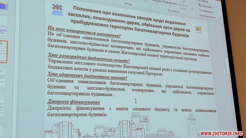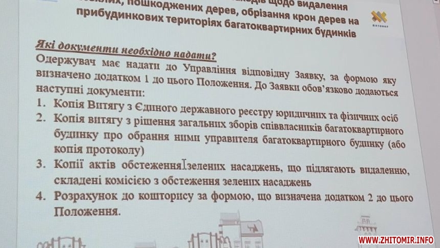 «Джерелом фінансування є кошти місцевого бюджету на кошти співвласників багатоквартирних будинків. Розпорядником коштів є управління житлового господарства в рамках виконання галузевої програми. Документи, які необхідно подати: копія витягу з Єдиного державного реєстру юридичних та фізичних осіб; копія витягу з рішення загальних зборів співвласників багатоквартирного будинку про обрання ними управителя багатоквартирного будинку, копія актів обстеження зелених насаджень, що підлягають видаленню, складені комісією з обстеження зелених насаджень; розрахунок до кошторису за формою», – каже начальник управління житлового господарства Житомирської міської ради.