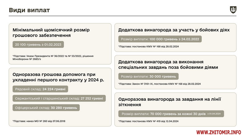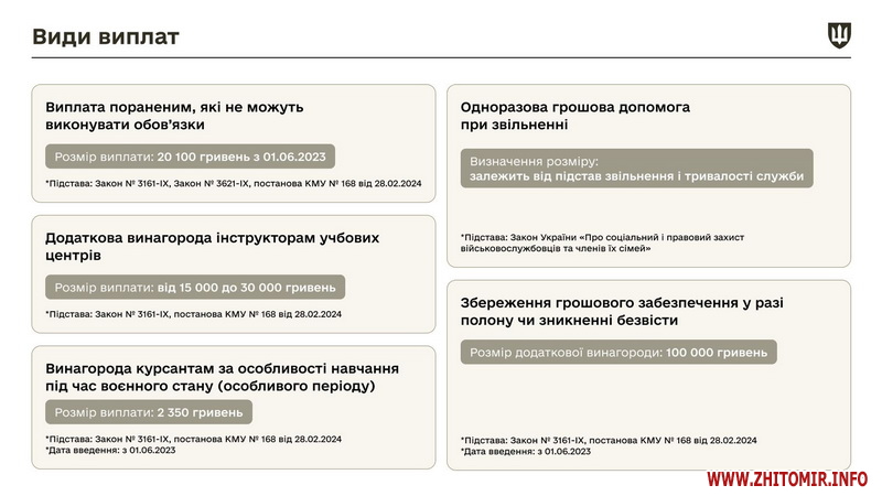 Як повідомляв Житомир.info, 12 квітня 2024 року Уряд оновив виплати військовослужбовцям та поліцейським, збільшивши їх до 170 тисяч гривень.