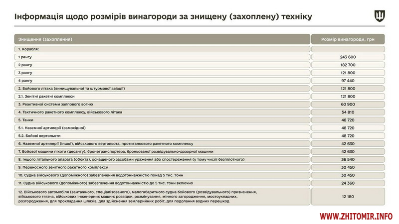 Інформацію щодо розмірів винагороди за знищену (захоплену) техніку дивіться у фото.