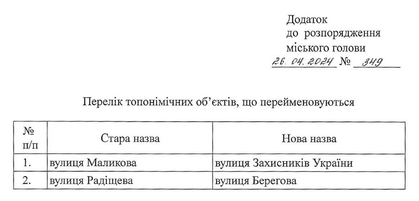 У додатку йдеться у перейменування двох вулиць: Маликова тепер буде «Захисників України», а Радіщева – «Берегова».