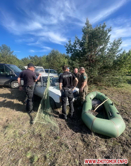 На території Коростенського району, поблизу с. Українка, інспектори виявили двох чоловіків, які ловили рибу на річці Ірша за допомогою надувного човна та риболовної сітки.