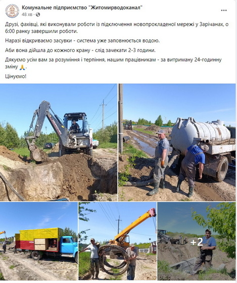 «Фахівці, які виконували роботи із підключення новопрокладеної мережі у Зарічанах, о 6:00 ранку завершили роботи. Наразі відкриваємо засувки — система уже заповнюється водою. Аби вона дійшла до кожного крану — слід зачекати 2-3 години. Дякуємо усім вам за розуміння і терпіння, нашим працівникам – за витриману 24-годинну зміну», - йдеться в повідомленні.