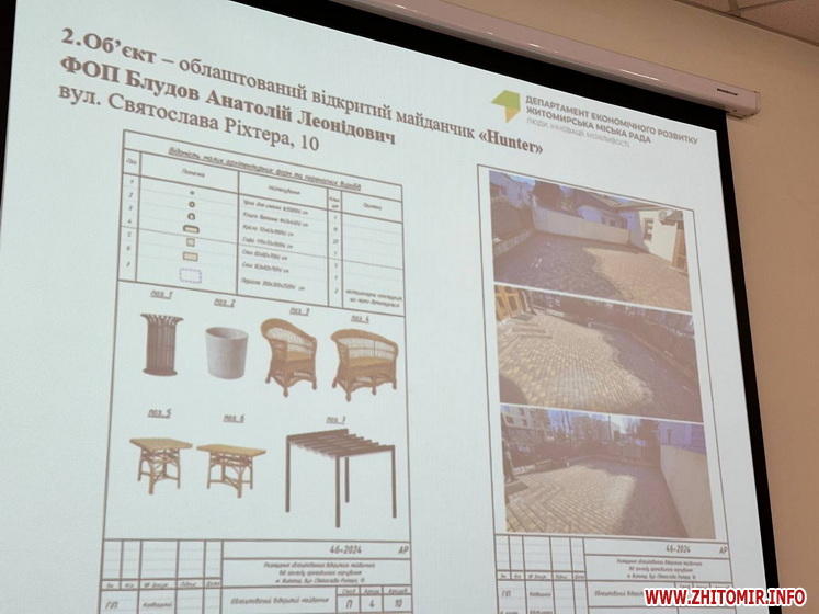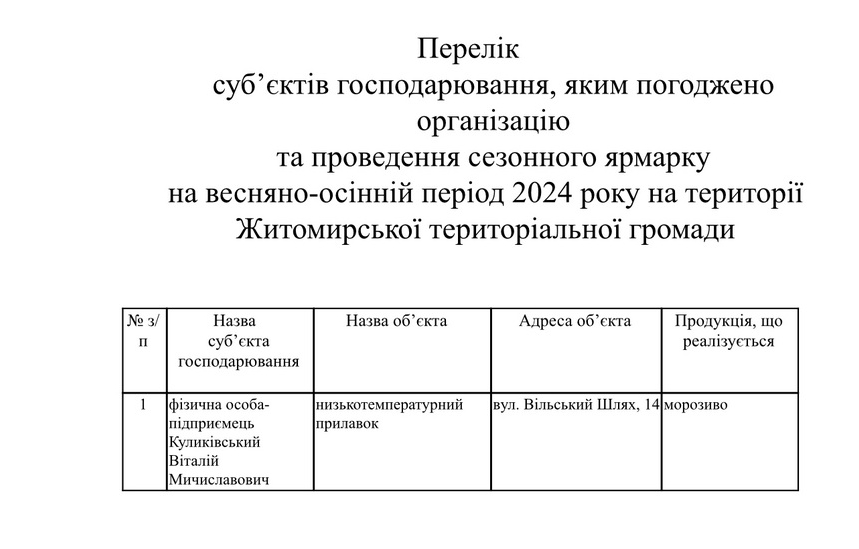 Виконком погодив встановлення та функціонування облаштованих відкритих майданчиків на весняно-осінній період 2024 року на території Житомирської територіальної громади. Дозвіл отримали 9 закладів та підприємець, який продаватиме морозиво. Майже усі об'єкти розташовані у середмісті Житомира.