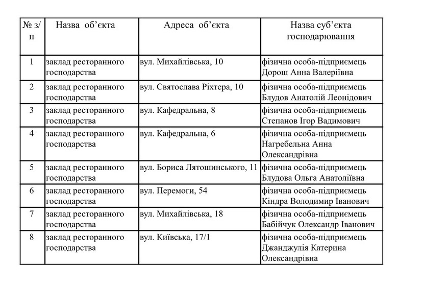 «Перший заклад: вул. Михайла Грушевського, 5-а, заклад ресторанного господарства «Not only wine». Це погодження просить ТОВ «Вайн хантерс», вперше подано ескізний проєкт – це новий об’єкт. Наступний – заклад ресторанного господарства «Львівський круасан» по вулиці Михайлівська, 10. Тут зміна суб’єкта господарювання. Наступний – заклад ресторанного харчування «Хантер» на вулиці Святослава Ріхтера, 10. Тут відбулася зміна суб’єкта господарювання. Далі – заклад ресторанного господарства по вулиці Кафедральній, 8. ФОП — Степанов Ігор Вадимович, ескізний проєкт поданий вперше. Наступний заклад – «Оливка в шоколаді», вул. Кафедральна, 6. ФОП — Нагребельна Анна Олександрівна також вперше подала ескізний проєкт. Наступний заклад ресторанного господарства по вул. Бориса Лятошинського, 11. Тут теж зміна суб’єкта господарювання, новий ескізний проєкт. ФОП — Блудова Ольга Анатоліївна. Далі – заклад ресторанного господарства вул. Перемоги, 54, кав’ярня «Шарікава», тут зміна ескізного проєкту. Михайлівська, 18 також «Шарікава», зміна ескізного проєкту. Та вул. Київська, 17/1 також «Шарікава», також зміна ескізного проєкту. Комісії ресторани пройшли, зауваження були відсутні», - розповіла директорка департаменту економічного розвитку міської ради Вікторія Сичова.