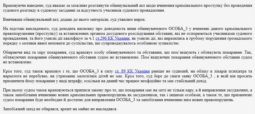 Суд визнав чоловіка у хуліганстві та призначив йому покарання у виді штрафу до прибутку держави в розмірі 1000 неоподатковуваних мінімумів доходів громадян, що становить 17 тисяч гривень.