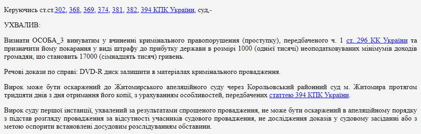Скриншоти з вироку Корольовського районного суду м.Житомира