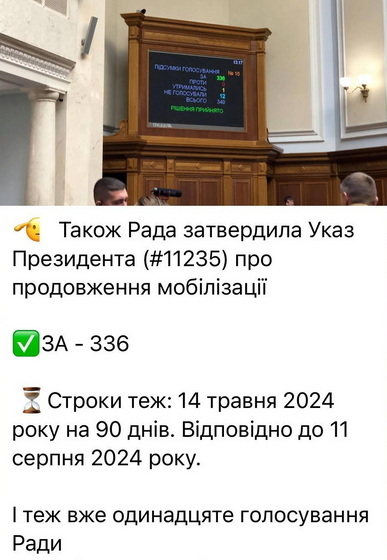 «Рада затвердила Указ Президента (№11235) про продовження мобілізації. «ЗА» – 336. Строки теж: 14 травня 2024 року на 90 днів. Відповідно до 11 серпня 2024 року», - пише Железняк.