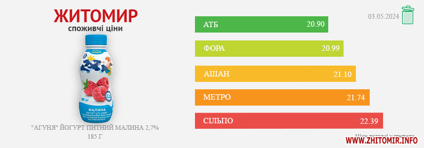 Моніторинг здійснено на основі інформації, отриманої за методом контрольної закупки 03.05.2024 р. у місцях продажу: АТБ, пр. Миру, 15 А, Фора, вул. Лятошинського, 2, Метро, вул. Ватутіна, 55-в, Сільпо, вул. Житній ринок, 1, Ашан, вул. Київська, 77