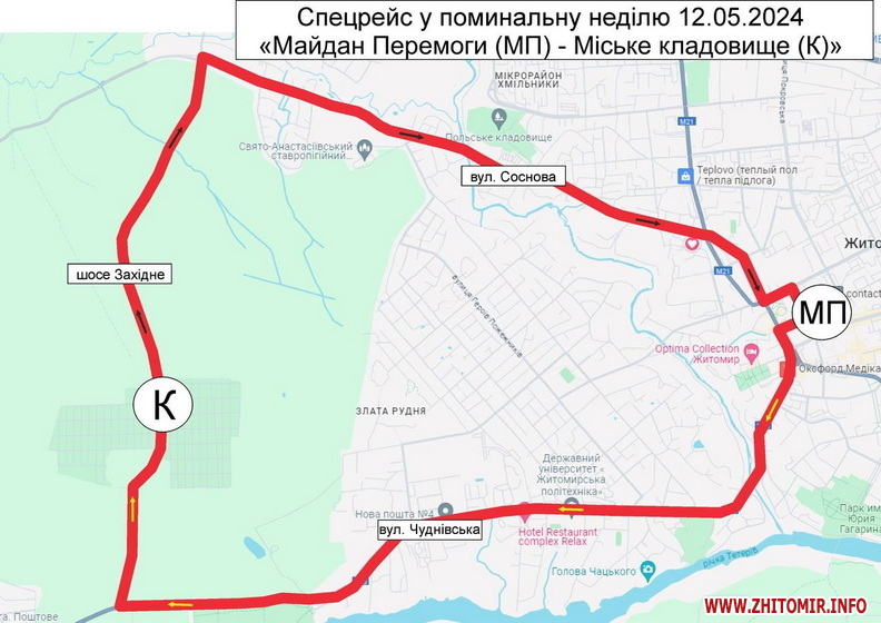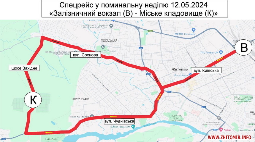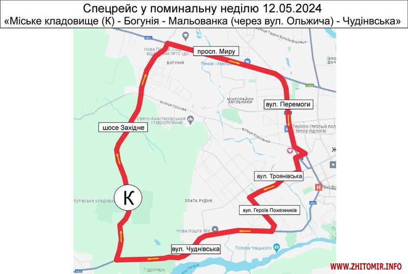 Також курсування міського автобусного маршруту №44 «Міське кладовище – Малинський ринок» буде здійснюватись через вул. Леха Качинського по вул. Чуднівській. Тобто без заїзду до району Мальованка.